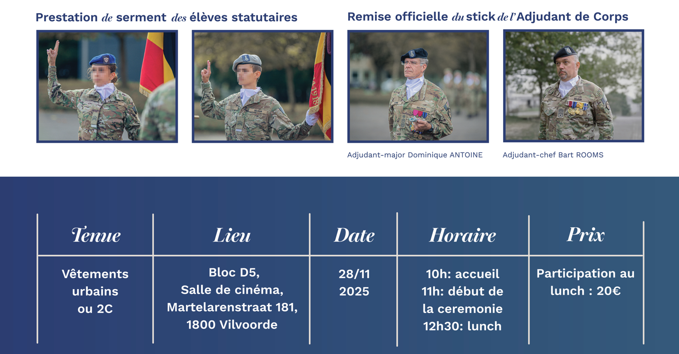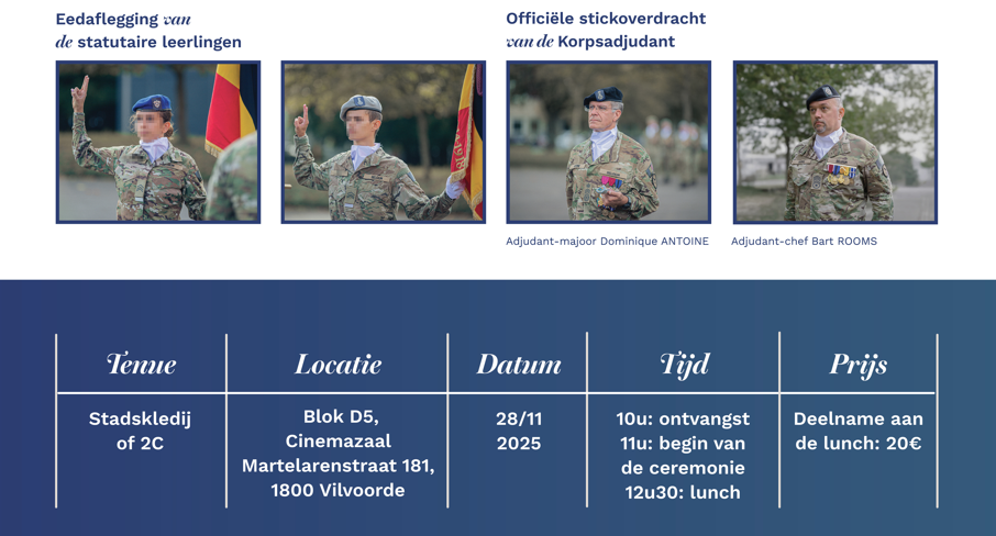 Lors de la cérémonie, la passation solennelle du stick de l'Adjudant de Corps aura également lieu entre l'Adjudant-major Dominique ANTOINE et l'Adjudant-chef Bart ROOMS. De cette manière, le commandement est transmis avec dignité, garantissant ainsi la continuité du leadership au sein de notre unité.