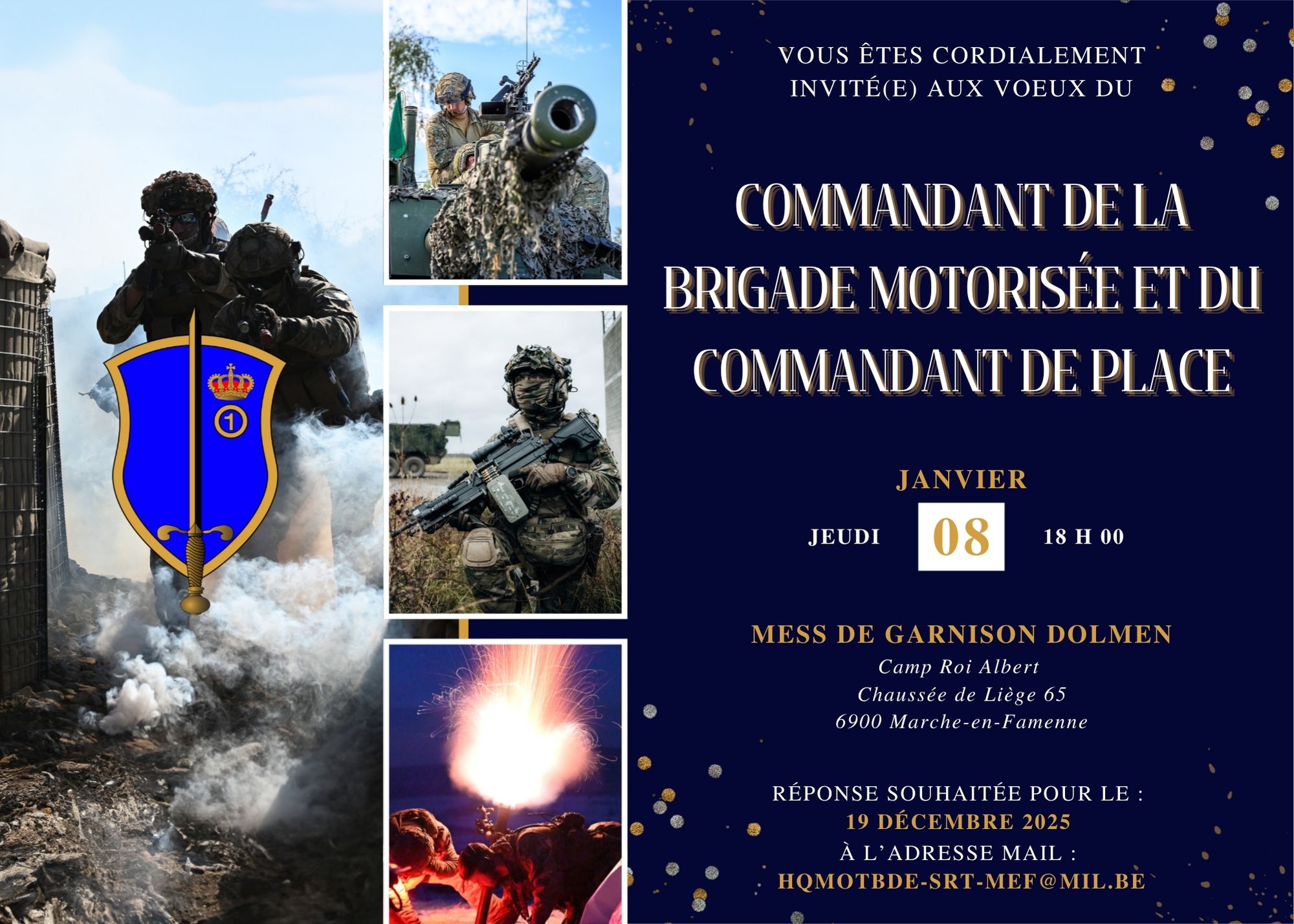 Le Colonel BEM Claudio MADILE, Commandant de la Brigade Motorisée, ainsi que le Lieutenant-colonel BEM François CORNELIS, Commandant de la Place de Marche-en-Famenne, vous invitent cordialement à leurs voeux annuels.