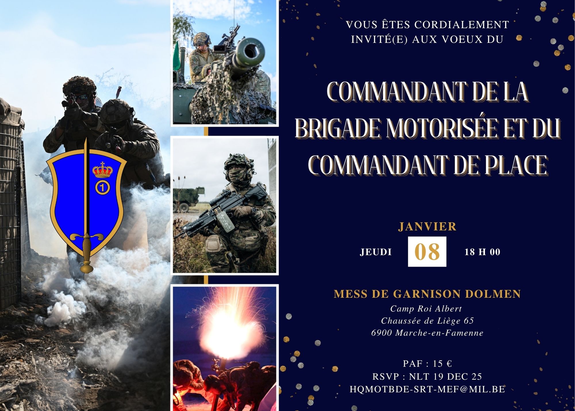Le Colonel BEM Claudio MADILE, Commandant de la Brigade Motorisée, ainsi que le Lieutenant-colonel BEM François CORNELIS, Commandant de la Place de Marche-en-Famenne, vous invitent cordialement à leurs voeux annuels.